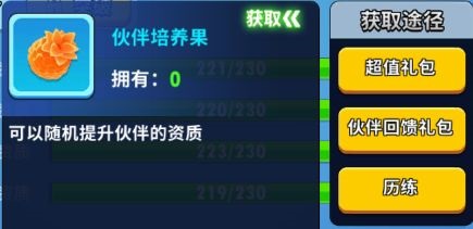 培养的主材料是伙伴培养果,有些小伙伴可能会觉得伙伴培养果比较稀缺,总是不够用。玩家经常打历练可以获得,包括超值礼包和伙伴回馈礼包也可以获得。