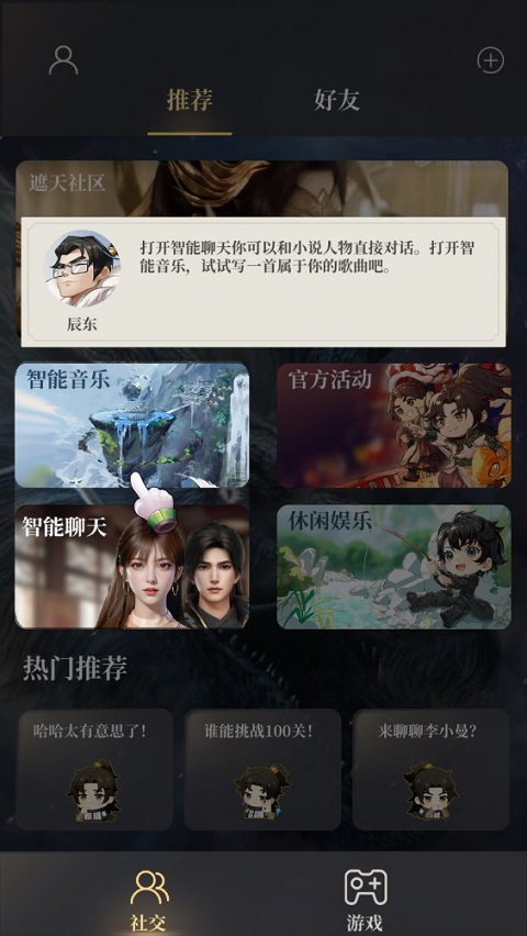2、当你进入游戏界面,会察觉到它与平常玩过的修仙游戏有所差异。在社交板块,不仅有智能音乐、官方活动、智能聊天以及休闲娱乐,还设有热门推荐。