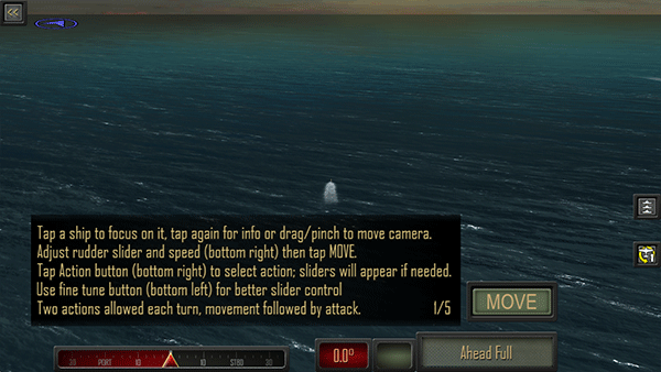 1. 点击某一艘船,即可聚焦该船,再次点击可获取相关信息,也可通过拖动或按压操作来移动镜头。接着,在右下角位置调整舵滑块以及速度,完成后点击“MOVE”。在右下角点击动作按钮来选择相应动作,若有需要,会显示滑块。利用左下角的微调按钮,能对滑块进行更精准的控制。每个回合允许执行两个动作,先移动,之后再进行攻击。