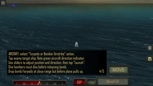 4、飞机:执行“鱼雷或轰炸机空袭”行动。点击敌方目标船只。留意绿色飞机方向指示灯。通过点击滑块来调整位置与方向,之后点击“启动”。俯冲轰炸机在投弹之前,务必先进行俯冲操作。在飞机起飞前,于近距离投放炸弹或鱼雷。