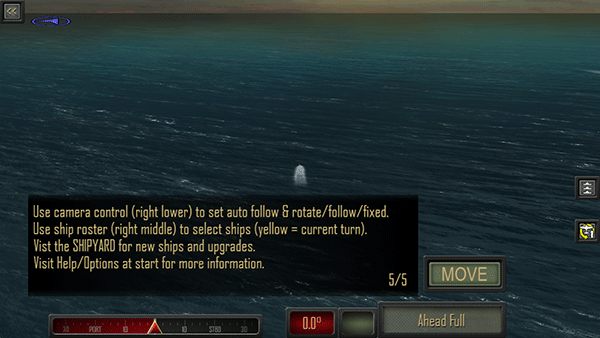 5、通过相机控制(位于右下角)来设置自动跟随&旋转、跟随或固定模式。利用船只名册(在屏幕右中位置)选择船只(黄色标识的为当前回合船只)。还可以参观造船厂中的新船及升级项目。若需获取更多信息,可访问Help/options。