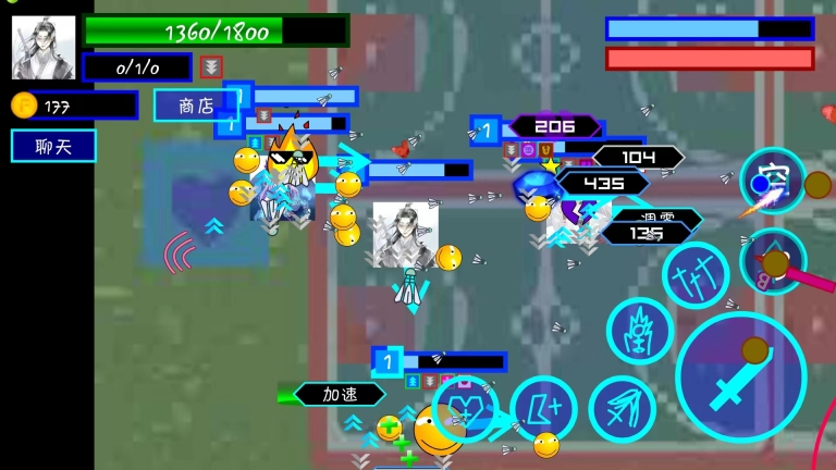 2、复古的游戏画风,不同的乱斗场景,这些技能有着不同的战斗特点,需要灵活选择。