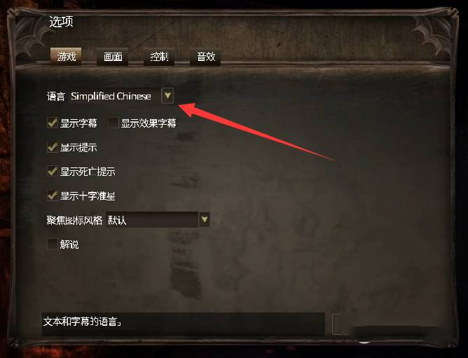 2、在选项的第一页“游戏”页面里,找到语言选项,利用下拉菜单将其选为simplified chinese(简体中文),这样就能成功完成设置。