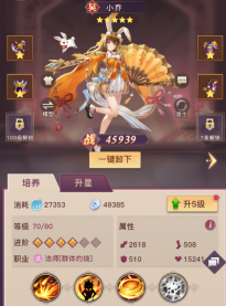 接下来,先选择一个输出类型的五星英雄升级进阶,只有要足够的银币、英雄经验和进阶石,五星英雄最高到100级。