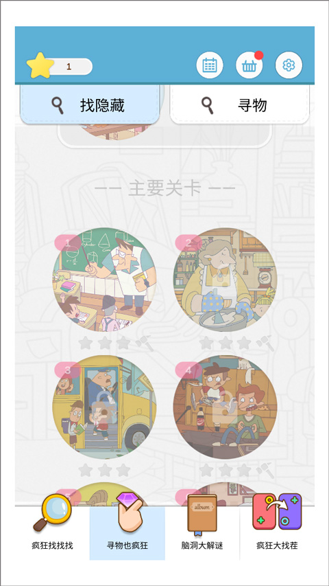 1、玩家开启游戏后,能看到丰富多样的玩法,诸如找隐藏、寻物、解谜、找茬等等。玩家只需挑选自己想玩的玩法,便可从第一关开启游戏之旅。