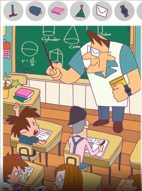 2、第一关场景设定为老师正在给学生授课,玩家要依据上方给出的提示,找出锤子、书、信封、手表等物品。