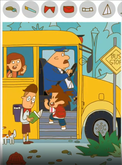 5、来到第三关,玩家要在学生校车上寻找领结、红信封、羽毛、笔刷等物件,同时要留意,叶子的形状存在差异。