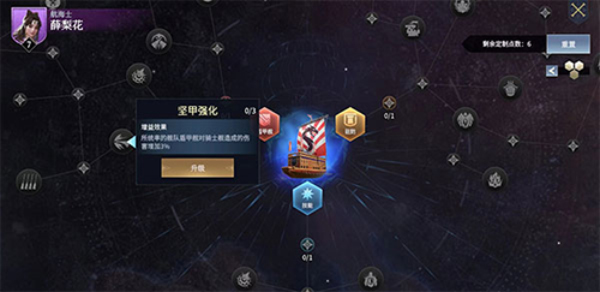 提督们通过升级获得定制点数后,能够进入战舰定制界面自由进行加点操作。战舰定制依据航海士的专长标签划分为三个板块,比如薛梨花的专长对应遁甲舰、驻防以及技能;多尼雅的专长则是综合、采集与辅助。由于每名航海士专长各异,所以战舰定制的具体内容也有所不同。