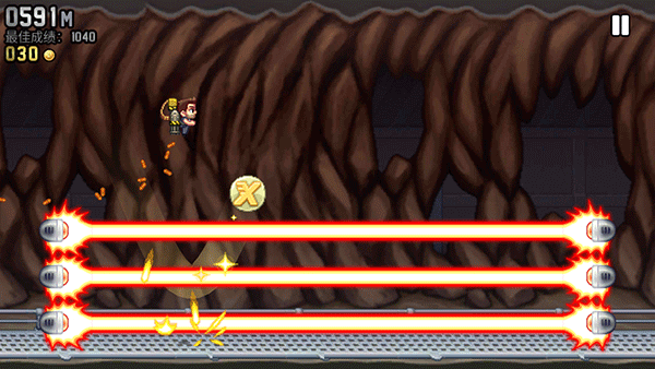 2、轻触屏幕任意位置即可开启游戏。在游戏过程中,点击屏幕,人物便会向上飞起;若停止点击屏幕,人物则会下落。玩家需依据金币与道具的位置来灵活调节操作。此游戏玩法类似像素鸟,不过还增添了射击功能。游戏期间会出现带有电流的障碍物,玩家必须躲避,切勿触碰,否则游戏就会结束。