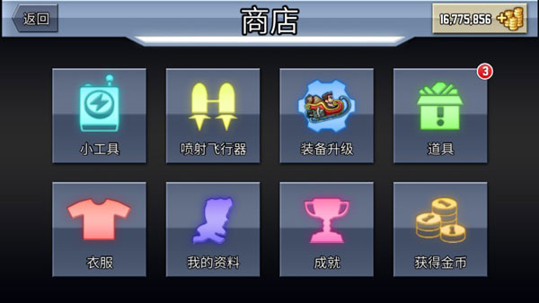 6、在商场里,你能看到小工具、喷射飞行器、装备升级、道具、衣服等相关选项。你可以根据自己的喜好进行购买和升级,让你的飞行体验更加畅快。以上便是火箭飞人最新版的玩法。