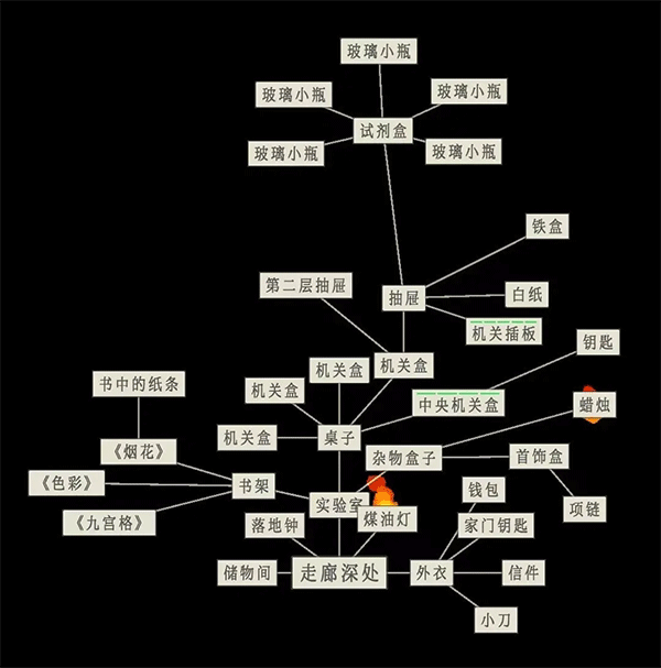 2、从办公室抽屉里泛黄的文件获取提示,将储物柜中的白纸、女士皮包里折叠的黄纸以及外衣内的信件,统统拿到煤油灯旁烘烤,从而获得新线索。