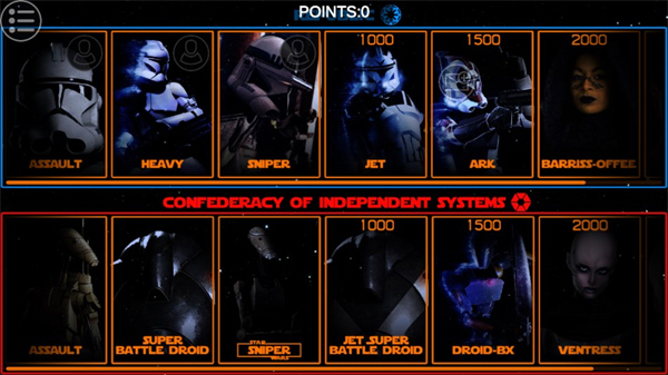 1. 挑选你的阵营,可从叛军、帝国军、克隆人士兵以及战斗机器人中选择。
