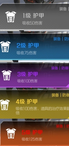 护甲是防护自身最重要的装备,游戏护甲的等级品质有5级,每一级的防御程度都大有不同,1级甲只有2层、2级甲3层、3级甲4层、4级甲和3级护盾值一样,但是4级甲有特殊词条、5级甲5层