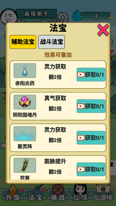 3、法宝能够帮助我们翻倍练气,获取灵力、真气、筋脉等;