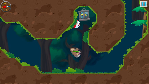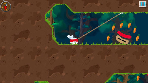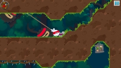 3、进入下一节之后,玩家需要注意在上方有小动物需要我们解救,玩家需要控制钩锁,把兔子荡到上方解救小动物。