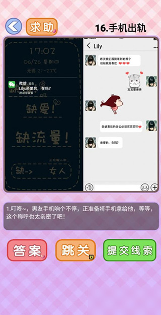 《你有问题》手游是一款经典且休闲有趣的“我说你做”小游戏。在游戏中,玩家需依照提示内容进行操作,选对即可顺利过关。为增添趣味性,游戏采用二次元画风,是一款剧情解谜游戏。玩家在其中将化身具有侦探特质的女孩,你的男朋友近来举动颇为异常,你得努力寻觅各类蛛丝马迹,以证实他是否出轨,这绝非易事,得靠你的火眼金睛与逻辑思维。此外,游戏能极为真实地把情侣间发生的事,细致地在游戏里呈现。玩家完成剧情任务后,可解锁“教训渣男”玩法,每次动手教训渣男都超解压。有需求的玩家可在本站免费下载畅玩。