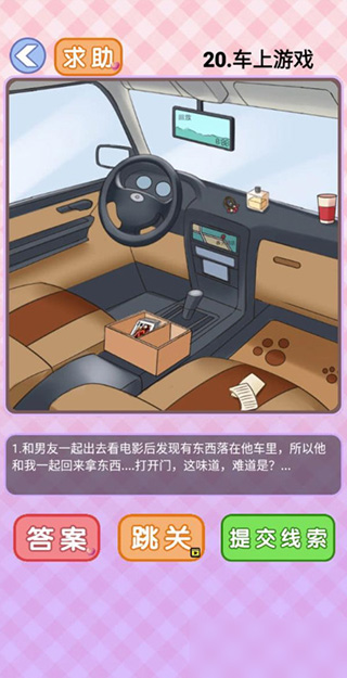 正确的操作步骤如下:首先点击提交放置在车上的香水,接着点击杂物箱里面的扑克牌,然后点击位于香水旁边的头绳,最后点击行车记录仪。