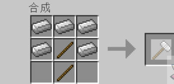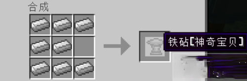 5、接下来,按照如图所示的配方,使用铁制作精灵专用铁砧(并非普通铁砧),同时准备一把锤子(锤子材质可以是木头、石头、铁、金、钻石或铝)。把铁砧放置在地面上,手持球盖或者球座,右键点击铁砧,即可将其放置在铁砧上(参照图示)。随后,手持锤子持续左键点击铁砧(锤子材质越优良,所需时间越短),当听到三次“叮”的声音后,就能获得球盖或者球座。
