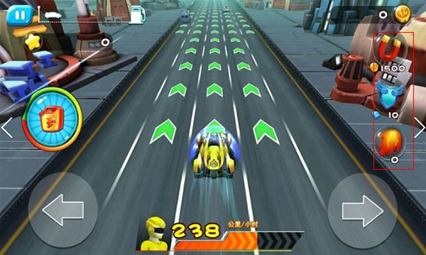2. 可通过点击左右键操控方向,或者滑动屏幕来移动赛车,屏幕右侧设有道具可供使用。