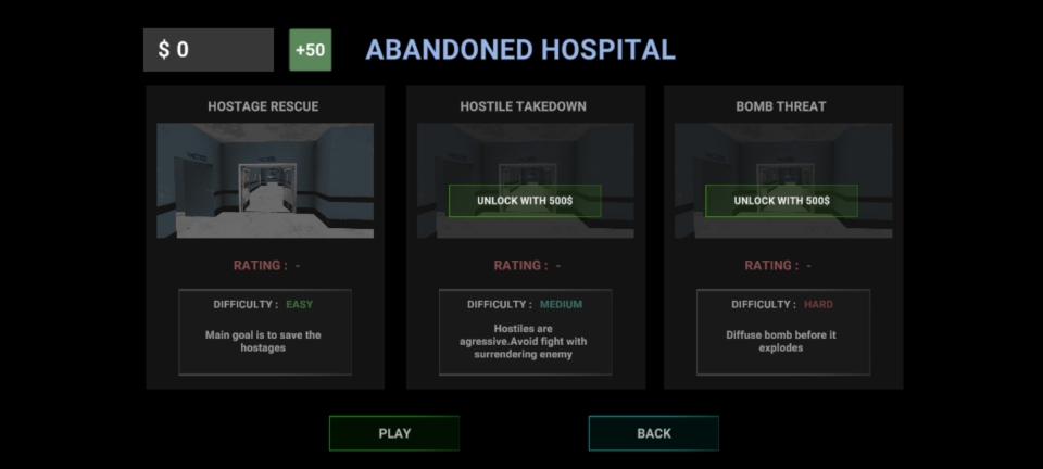 4、挑选好武器后,推开房门走出去,选择“HOSTAGE RESCUE废弃医院”,主要任务是解救被劫持的人质,接着点击【play】。