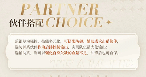 蓝银草为强控,技能多元化,可搭配防御、辅助或攻击系伙伴,选防御系伙伴作为后排控制输出,实现队伍最大化输出;