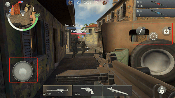 3、在《二战前线1942》游戏开始后,通过左下角的摇杆操控角色移动,右侧则用于控制方向、射击、治疗等操作。