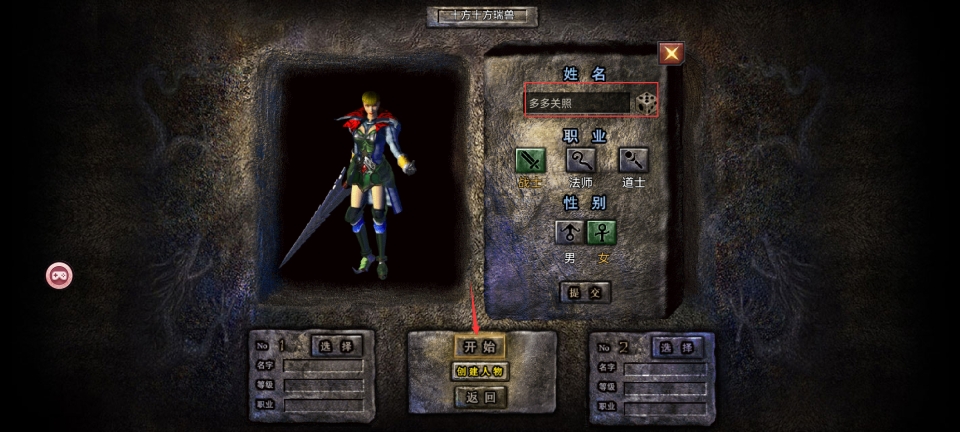 3、进入游戏后,你可以先给自己更改一个名字,选好职业与性别后点击提交,接着依次点击【开始】。