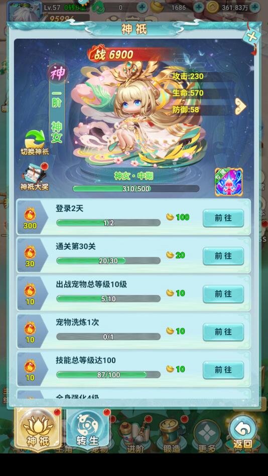 当玩家达成特定的登录、通关以及宠物培养任务后,便能够开展神祇突破与转生操作,通过这一方式,能够提升攻击、生命以及防御属性。