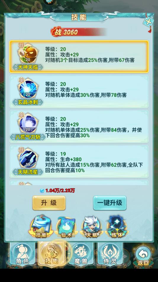 如以下图示,从角色界面进入技能系统后,点击“一键升级”,即可提升等级与属性。