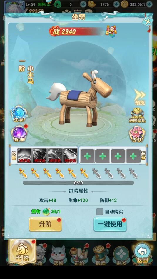 解锁坐骑后可以通过升阶、注灵、炼神等来提升属性