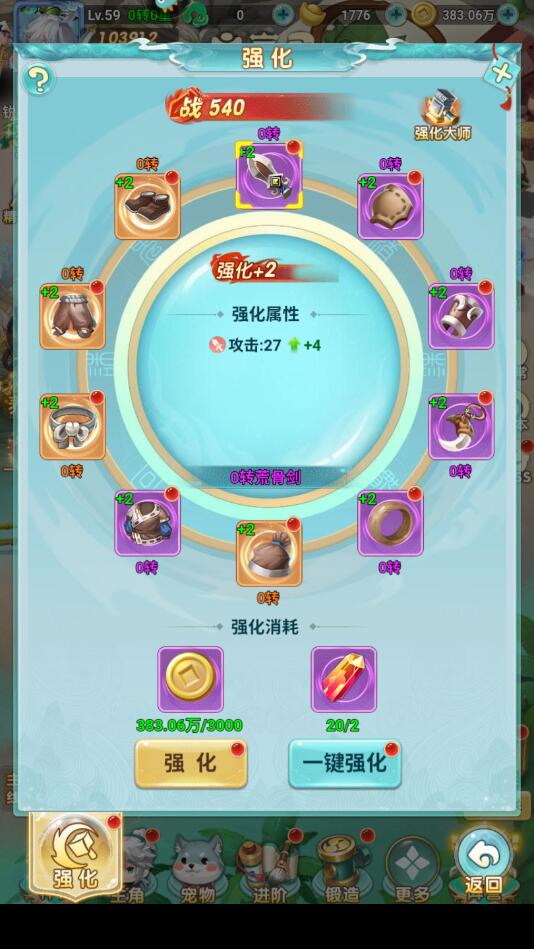 每次进行强化都要消耗货币与强化石,而获取这些道具的途径是闯关和挑战副本,获取后点击一键强化即可。