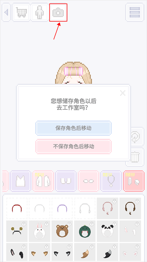3、装扮后你可以点击屏幕上方的相机图标即可进行保存进到工作室。