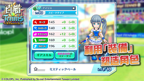 5、此外,玩家能够借助“装备”来塑造角色,为钟爱的角色换上炫酷的“球拍”与“球鞋”,提升角色等级,打造独具个人特色的网球选手。不仅如此,玩家熟知并喜爱的“星盘”也会在此重现,通过“星盘”可强化和解放角色的各项技能,从而顺利取得胜利。