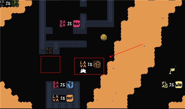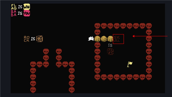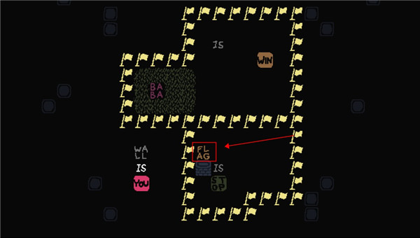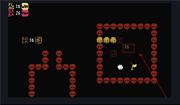4、更改一下过关条件,让它变成“rock is win”,你便可以不再理会那个旗子。直接触碰石头即可过关。