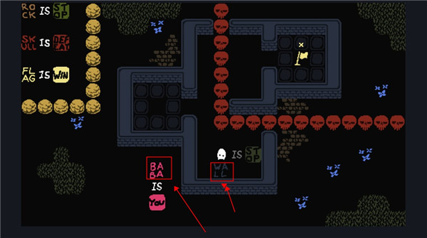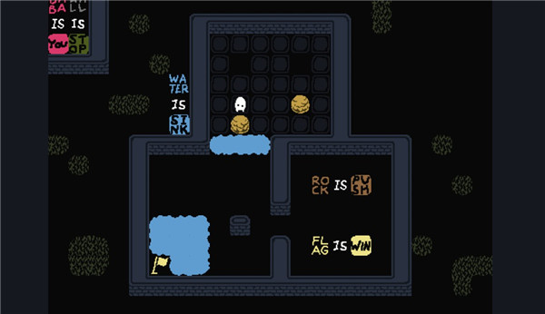 2、之后,你会见到关于这个“规则”的各类变体,像双层地图、利用箱子填坑、仅仅推出通路之类。在场景里,“baba is you”“rock is push”“flag is win”这些语句,实际上就是当前关卡的规则设定。