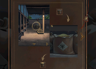 24、点击旁边的茅草垛,开启移动茅草的小游戏。当完成该小游戏后,就能把茅草垛移至柱子下方,随后从灯上面获取锋利的匕首。