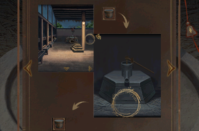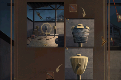 14、在场景里点击铜漏,把一桶水倒进铜漏,然后安装好木刻尺,接着通过点击铜漏上方的进水口以及下方的出水口,将刻度尺调节至卯时刻度。