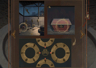 28、用谷粉喂马,趁马低头时查看墙壁上的线索。点击场景左边墙根处的木箱,依照马匹背后墙上的图案,如图片所示来调整转盘,进而打开木箱。