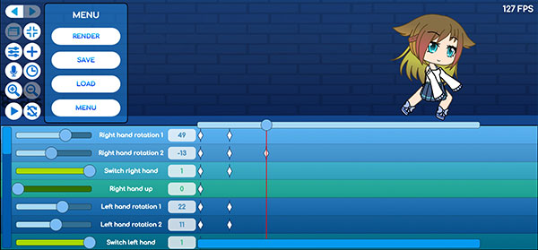 3、完成上述操作后,便能进入动画编辑界面。此界面功能繁多,在此不做过多赘述,仅简要介绍一下功能区块。左下方是角色动作区域,通过文字左侧的滑钮能够调整上方角色的动作,这与姿势编辑类似。右侧则是时间轴,比如,当我们调整右手移动,并在右侧时间轴中创建一个新区域时,右手就会在设定的这段时间内移动。