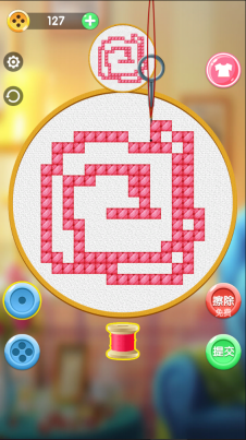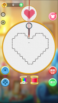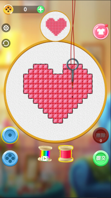 5、当你开始刺绣后,会看到呈现的是一个爱心图案的模式。你只需要将图案中的空白部分填满就行。要是不小心刺到图案外面了,别担心,可以使用右侧的擦除功能把多余的刺绣痕迹去掉。