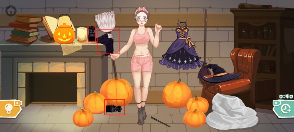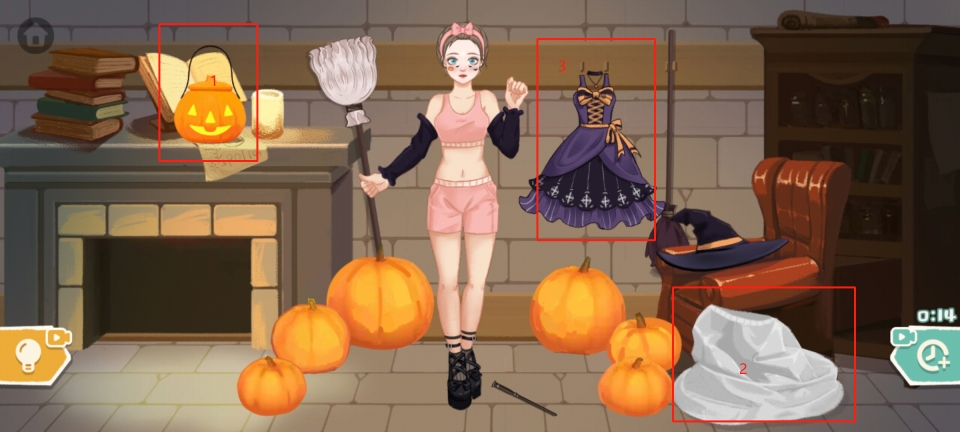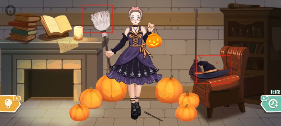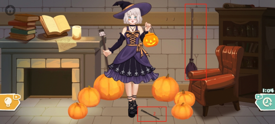 9、接着,将扫帚放置在小姐姐的右手上,再用小刀把周边的南瓜雕刻成南瓜灯,如此就能顺利通关。