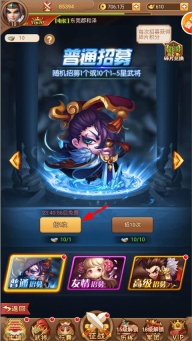 7、在无双招募页面,玩家能够消耗元宝来进行招募,每一期招募到的神将各不相同。