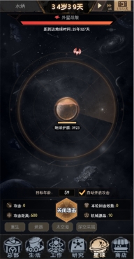 战斗玩法的核心在于对武器的钻研,前期主要依靠轨道炮与激光炮。对这两种武器进行强化,强化等级越高,出现高级词条的概率也就越高。在前期资源有限的情况下,获得较为合适的词条即可。这里给大家分享一个小窍门,把目标年龄设定为59岁,如此一来,每个轮回都从59岁开始发起攻击,能让自己多存活一阵子。