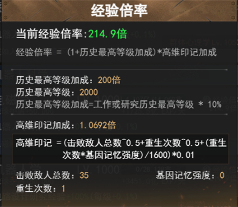 经验倍率从何而来?从游戏说明可知,每项研究与工作的经验倍率都是经计算得出。影响它的参数,一是历史上当前研究/工作的最高等级,二是高维印记加成。历史最高等级不难理解,慢慢刷就能提升。而关键又回到上文提到的高维印记加成,这也是本攻略的重点。高维印记加成是每次轮回后会增长的一个数值。影响高维印记的参数包括:击败敌人总数、基因记忆强度、重生次数。这三个参数只会上升,不会下降。所以,只要大家持续玩下去,高维印记就会不断增加。高维印记不断增加,经验倍率也会随之持续增长。经验倍率持续增长,那将研究学到满级岂不是指日可待?