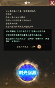 相信玩过几轮的玩家已经发现,轮回并不算游戏失败,而是涅槃重生变的更强的途径,合理的利用轮回功能,能大大提升游戏进程,并且极大程度影响上文中提到的经验倍率加成。
