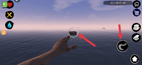 5、勾住后再次点击钩子按键,将勾住的物品拉回至木筏旁