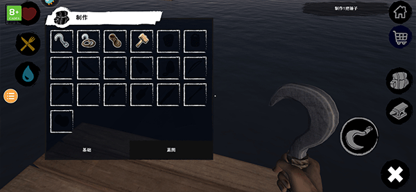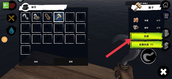 7、获取到资源后就能打造锤子,玩家只有拥有了锤子,才能够扩建木筏、制造各类生活工具。