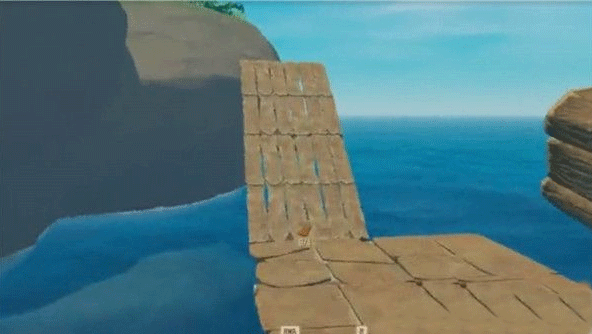 4、沿着斜坡向上搭建,直至能看见岛上的陆地,此时跳上去,就能成功登岛了。
