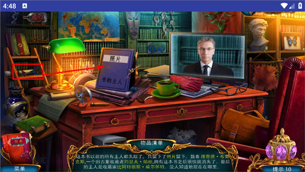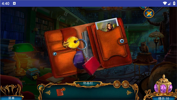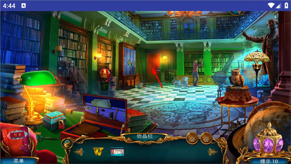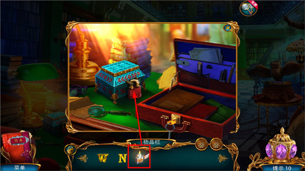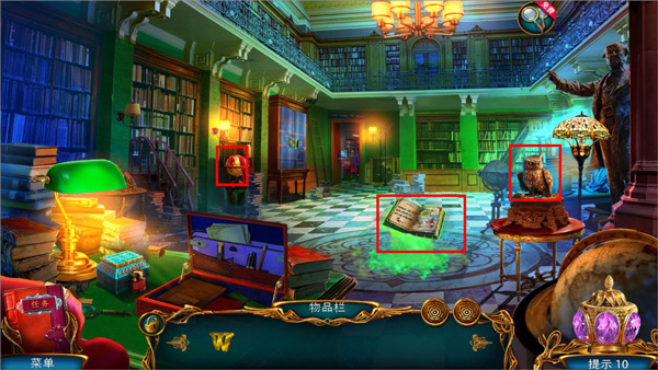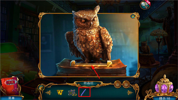 11、点击悬浮在中间位置的书,接着点击旁边的猫头鹰,收集拼图嵌块。随后,点击左手边被红色布覆盖的地球仪,打开后可获得紫外线灯以及拼图嵌块。