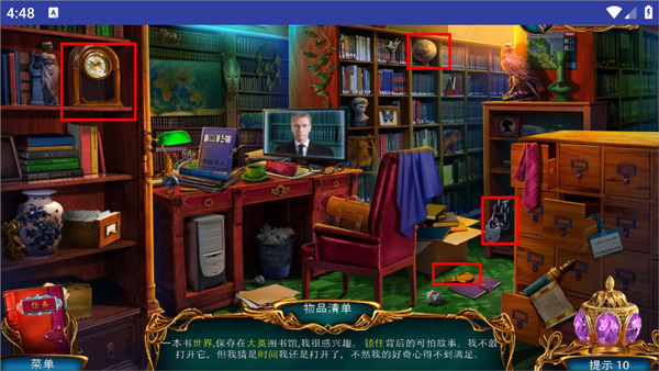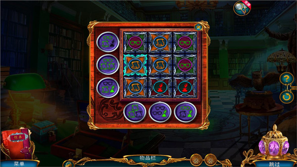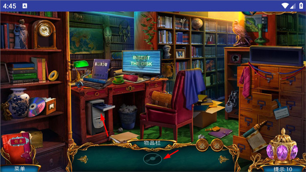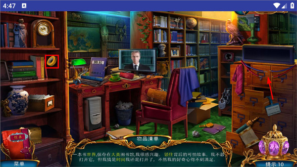 7、另外,可收集后方书架上的地球仪,以及右边柜子下方散落的锁链,同时把左边下方的钟放置到左边架子上。